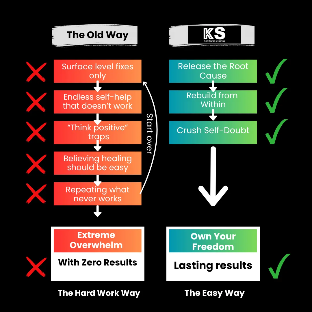 Unlike traditional methods, this system allows you to identify and release the subconscious beliefs and patterns that keep you stuck, rewire your mindset, and rebuild self-trust while eliminating overthinking, endless self-help cycles, and temporary fixes that don’t address the core issue.